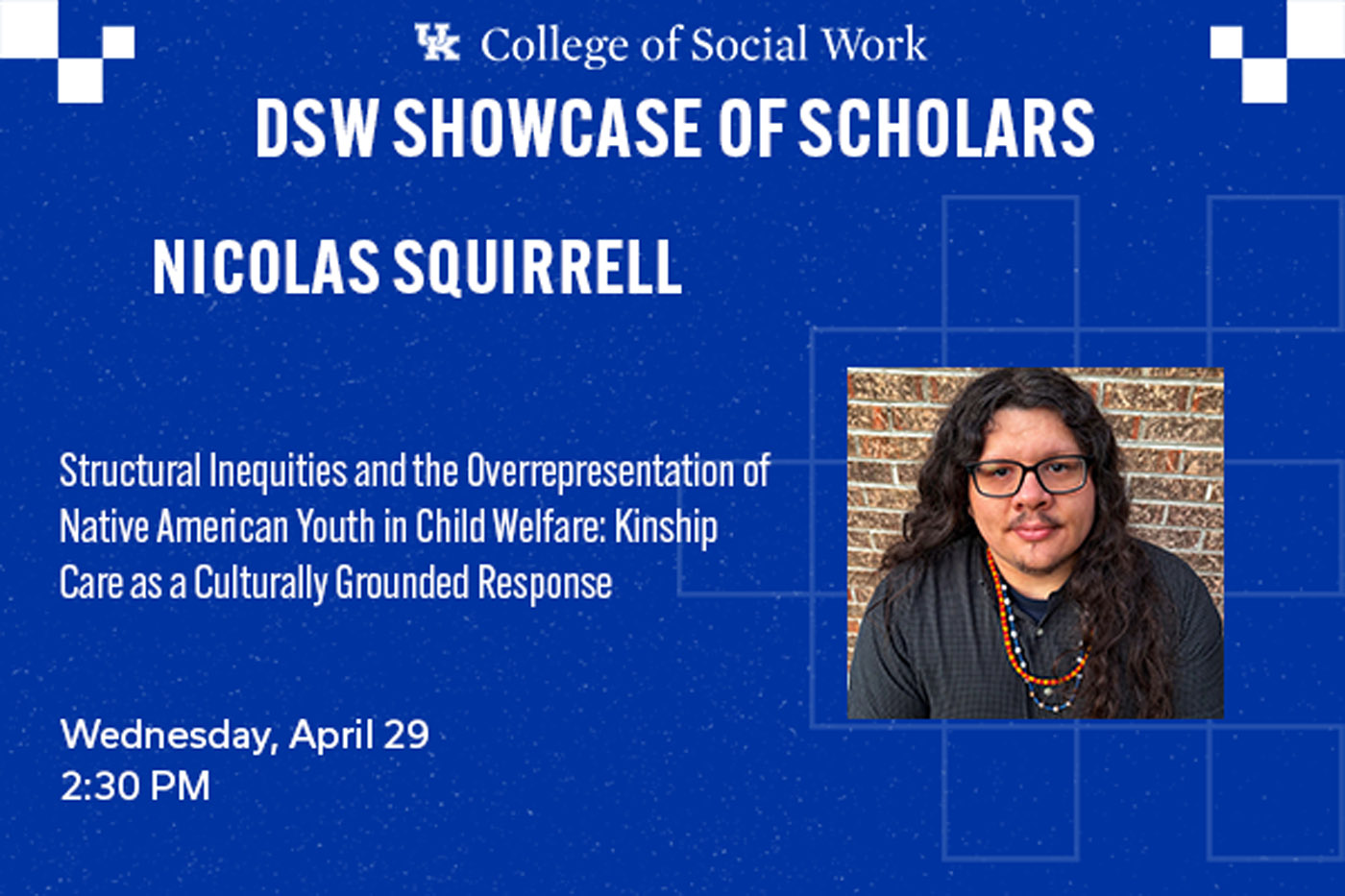 Nicolas Squirrell, DSW Candidate, is a Doctor of Social Work candidate at the University of Kentucky, with an expected graduation in Spring 2026. He currently serves as a social worker at Cherokee Family Safety in Cherokee, North Carolina, where he has dedicated nine years to providing culturally responsive child welfare services to Native American children and families. His professional practice focuses on kinship caregiving, family preservation, and supporting Tribal communities through trauma-responsive, culturally informed frameworks.
